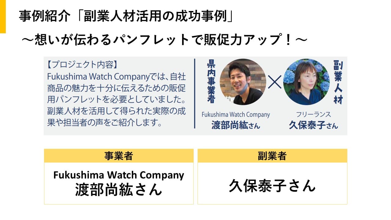 Fukushima Watch Company では、自社商品の魅力を十分に伝えるための販促用パンフレットを必要としていました。副業人材を活用して得られた実際の成果や担当者の声をご紹介します。
